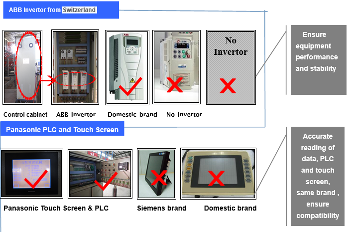 1. नियंत्रण प्रणाली: अॅडपॉट आयात एबीबी इनवर्टर आणि पॅनासोनिक पीएलसी आणि टच स्क्रीन इलेक्ट्रॉनिक कंट्रोल घटक हे उपकरणांचे स्थिर ऑपरेशन सुनिश्चित करण्यासाठी.