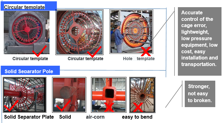3. पिंजरा व्यास त्रुटी नियंत्रण शुद्धता, लाइन रीबर स्पेसिंग त्रुटी लहान आहे, 1 सेमी आत नियंत्रित केले जाऊ शकते; एक मीटर कॉइल्स अंतराची त्रुटी 5 मिमी आत नियंत्रित केली जाऊ शकते.